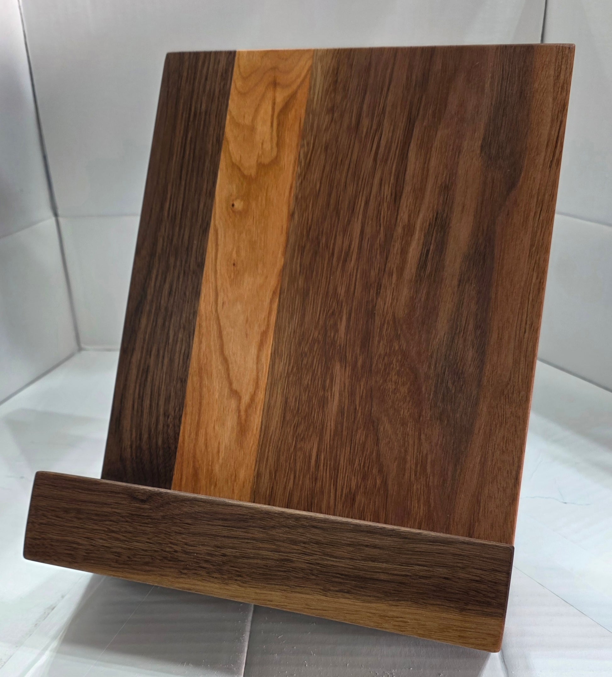 Handcrafted cookbook stand made from sustainable domestic walnut and cherry hardwood. Simple voc-free wood oil finish. Folding stand so it can be stored out of the way. Simple classic design use as a bookstand or tablet stand. Each piece is handmade, please expect wood-tone and color variations.